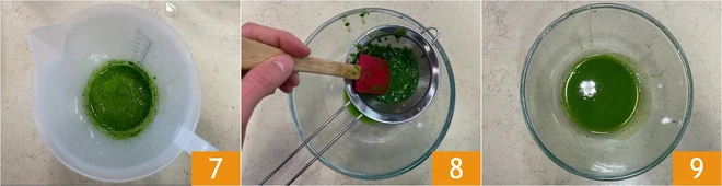 Once you have obtained a homogeneous mixture 7, strain it through a fine-mesh sieve to make it smoother 8 and set aside 9.