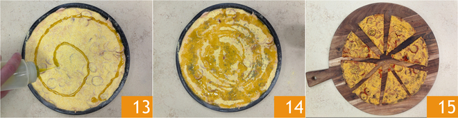 Pour the mixture into a 12.5-inch non-stick pan, greased and floured 10, and level it well 11. Sprinkle the surface with cornmeal 12.