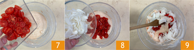 Add the tomatoes 7 and the onion 8, then mix everything well 9.