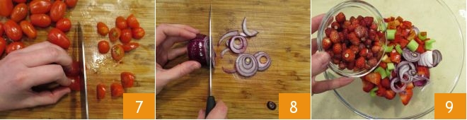 move on to the cherry tomatoes and cut them in half 7, peel the red onion and slice it coarsely 8. Transfer everything into a bowl, add the wild strawberries 9