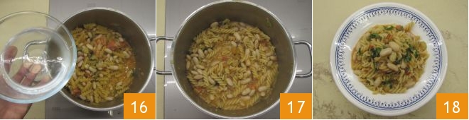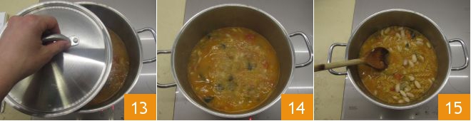 cover with the lid 13 and cook over medium heat but not too high for 20 minutes, stirring occasionally. After this time, remove the lid 14 and cook for another 15-20 minutes or until the beans are tender. At this point, add the pasta and stir 15.