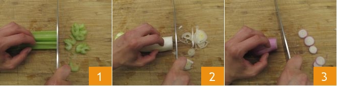 To make the summer pasta and beans, first wash and trim the celery, then cut it into slices 1, next peel the leek, trim it and slice it thinly 2. Clean the spring onion and cut it in the same way 3.