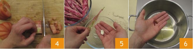 Wash the tomatoes, cut them into slices and then into cubes 4. Finally, shell the fresh beans 5. Once the vegetables are ready, you can proceed to cooking: heat the oil in a large pan, flavor with the chili pepper for a few moments 6.