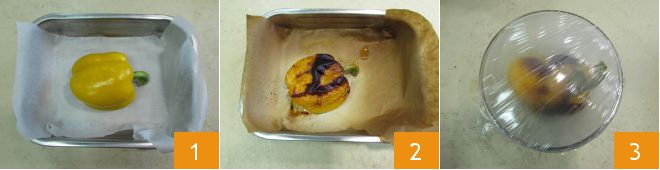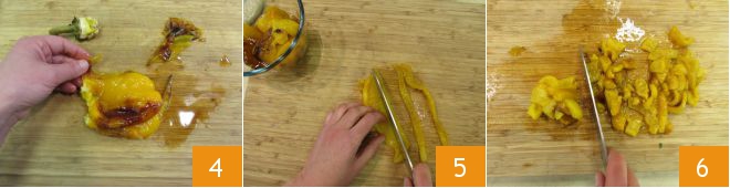 Once the bell peppers have cooled, remove the outer skin and seeds 4, then slice them into strips 0.4 inches wide 5 and then into pieces 1.2-1.6 inches long 6.