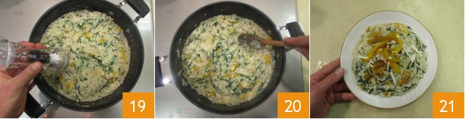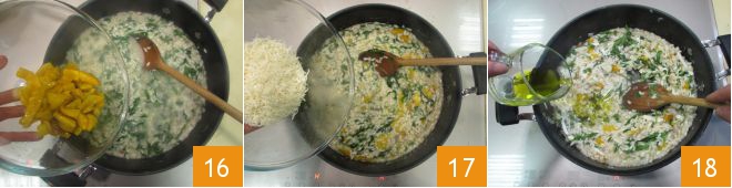 When there are 4-5 minutes left in the cooking time, add two-thirds of the bell peppers 16, then turn off the heat and cream the risotto with the grated salted ricotta 17 and 2 tablespoons of oil 18.