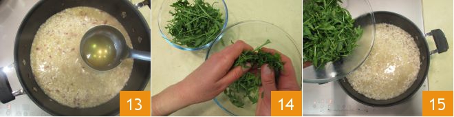 And immediately after, add 2-3 ladles of warm vegetable broth 13. Continue cooking, seasoning with salt and adding more vegetable broth as needed. When the risotto is halfway cooked, tear the arugula by hand 14 and add it to the pot 15.