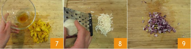 Collect the cooking liquid because it will be needed later 7. Before proceeding to cook the rice, grate the salted sheep ricotta using a coarse grater 8. Finally, clean and chop the red onion 9.