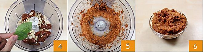Add the basil leaves 4 and blend until you get a rather coarse mixture 5. At this point, your sun-dried tomato pesto is ready to be used as a flavorful condiment 6!