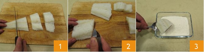 To prepare sweet and sour Ligurian cod, take the already desalted and skinned cod (if you use salted cod it will require at least 3 days of soaking as indicated in the cooking school guide: How to Desalt Cod): start by cutting the fillet into pieces 1, once cut you can also remove all the bones with kitchen tweezers 2. When you have finished, flour all the pieces, shaking them gently to remove excess flour 3.