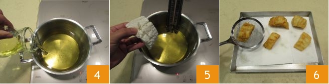 Meanwhile, pour plenty of seed oil into a high-sided pot 4 and when it is hot, cook a couple of pieces at a time, for 4-6 minutes depending on thickness, at a temperature between 356°F and 374°F 5, until they are golden brown. As you cook the cod pieces, drain them on absorbent paper 6.