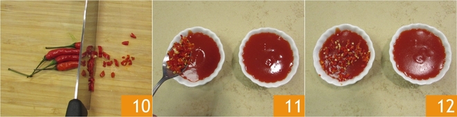 For a spicy variant, finely chop some red chili 10 and add it directly to the sauce 11. Enjoy the sweet and sour sauce with your favorite Chinese dishes 12!