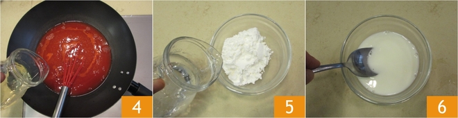 Also add the vinegar and mix well with a whisk as you bring everything back to a boil 4. Meanwhile, place the cornstarch in a separate small bowl, add 4 tablespoons of water 5, and mix the mixture with a spoon 6.
