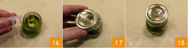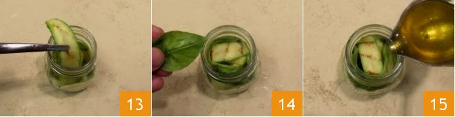 At this point, you can proceed with the filling: fill the jars with the cold zucchini, pressing them well inside with a fork or kitchen tongs 13 then add the basil leaf 14. After the marinade has cooled, add it little by little until it completely covers the zucchini 15 but stopping 1 cm from the edge.