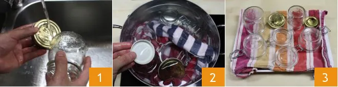 Carefully wash the jars and their lids 1, then line a large pot with high sides with a clean dish towel and place the jars in the pot with the opening facing upwards. Wrap one or more dish towels around the jars so they don't break by bumping into each other during boiling.