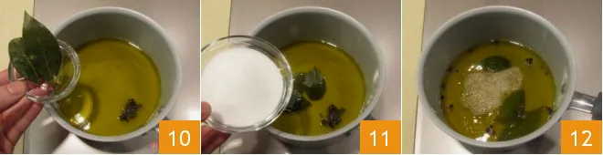 Add also the juniper berries, peppercorns, bay leaves 10, and finally the sugar 11: cook and stir with a wooden spoon until it reaches boiling point 12, then immediately turn off the heat and let the mixture cool.