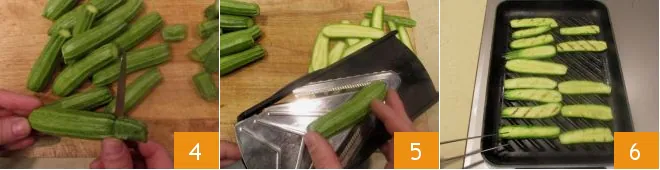 After completing this important operation, wash, dry the zucchini thoroughly and remove the ends 4. Then, using a mandoline or a vegetable peeler, cut them into thin slices lengthwise 5, then blanch them on both sides for a few seconds on a hot grill, turning them with kitchen tongs 6.