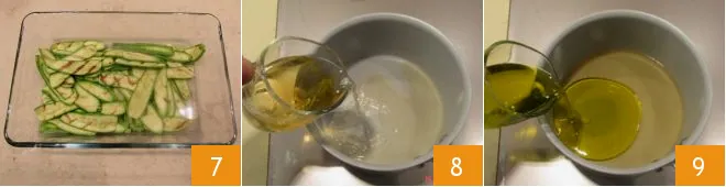 Place the grilled zucchini to cool completely in a baking dish 7 and in the meantime, prepare the marinade. In a non-stick saucepan, place vinegar 8 and olive oil 9, then turn on to low heat.