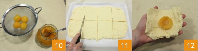 Drain the apricots from their syrup 10. If you use dried apricots, you will need to rehydrate them in warm water, then gently squeeze them, and if they have pits, remove them. If it is in season, you can use small fresh apricots. When the dough is cold and manageable, divide it by cutting it into 8 squares of the same size 11, take each portion and place half an apricot in the center 12.