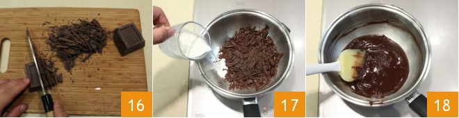 In the meantime, you can prepare the accompanying chocolate sauce. Chop the dark chocolate 16 and place it to melt in a double boiler (or in the microwave); when it is melted, add the hot cream 17 and stir until you get a thick cream 18, which you will set aside.