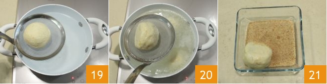 When the dumplings are well-chilled and compact, boil them (4 at a time) by allowing them to simmer for about 10 minutes in boiling salted water 19, then drain them 20, and pass them in a mix of breadcrumbs, brown sugar, and cinnamon powder 21.