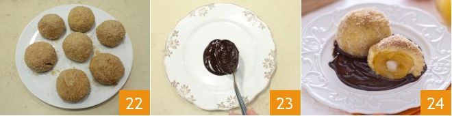 Gradually place the breaded dumplings on a serving plate 22. On a dessert plate, distribute the chocolate sauce on the bottom 23 and place the cooked sweet apricot dumplings on top, optionally garnishing with melted butter 34.