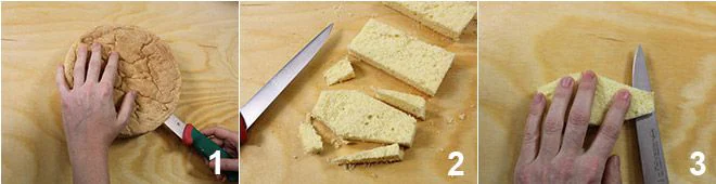 To prepare the sweet Halloween coffins, draw the shape of a coffin on a cardboard, 4 inches long and 2.5 inches wide. Divide the sponge cake into two layers 1 and cut out at least 10 shapes following the cardboard drawing 2, then slice them horizontally 3.