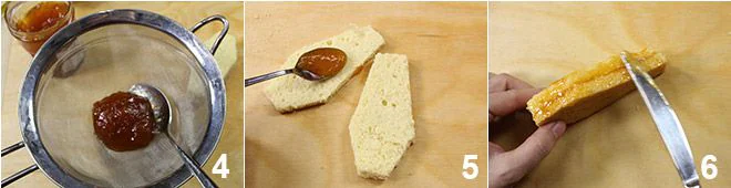 Sift the jam with a strainer 4 and spread it on the coffins: fill the inside layer 5 and carefully cover the sides and the top as well 6.