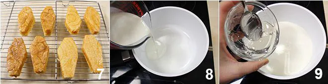 Place the coffins on a wire rack 7 and start preparing the chocolate glaze: heat the cream over low heat 8 and, when it reaches the boiling point, remove it from the heat and add the glucose 9