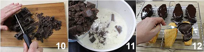 and the chocolate, previously chopped with a knife (10-11). Stir until the chocolate is completely melted: you should get a creamy glaze. When the glaze is ready, pour it over each coffin 12, letting it drip over all sides and trying to cover all the jam-coated surfaces evenly (to facilitate this operation, you can use a flat-bladed knife).