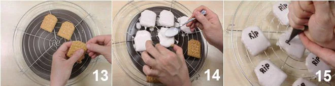Now prepare the tombstones: remove the corners from the upper end of all the cookies 13, then prepare a water glaze by dissolving powdered sugar in a bowl with 2 teaspoons of boiling water and stirring until you obtain a homogeneous and thick glaze (for more details on the water glaze recipe click here). Cover the cookies with the glaze 14, let them drain on a wire rack and allow them to dry well. Melt the dark chocolate in a double boiler (or in the microwave), transfer it to a pastry bag and decorate each cookie with the initials RIP (Rest In Peace) 15.