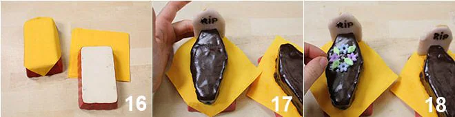 Now take some rectangular bowls, turn them upside down and cover them with a colored paper napkin 16, as shown in figure 16, then place a coffin on top, upon which you will lean a tombstone 17. Finally, decorate the surface of the coffin with wafer flowers 18: the sweet Halloween coffins are ready to be enjoyed!
