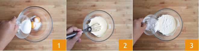 To prepare the sweet puff pastry shells, first make the custard. Pour the milk into a saucepan and heat it on the stove. Meanwhile, pour the egg yolks and sugar into a bowl 1. Whisk until you get a whipped mixture 2. Add the flour 3