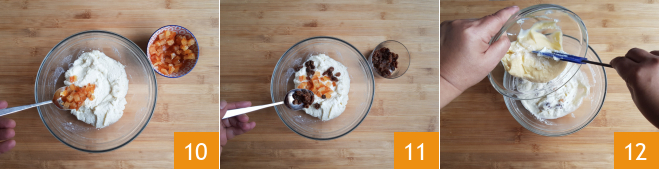 Then add the candied orange cubes 10 and raisins 11. Mix everything. Add the custard 12,