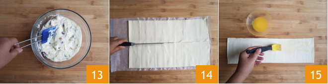 mix again 13 and store the mixture in the refrigerator covered with plastic wrap. Unroll the puff pastry and cut it in half widthwise 14. Brush one half with the melted butter 15