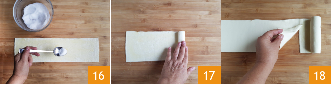 and sprinkle it with sugar 16. Start rolling the pastry from right to left 17 and before finishing, place the second strip of pastry on top, making it adhere to the previous layer, as if the two pastries were joined 18.