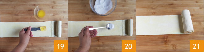 Brush this part as well with the melted butter 19 and sprinkle with granulated sugar 20. Continue rolling 21,