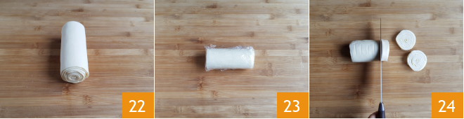 until you get a roll about 2.5 inches thick 22. Wrap in plastic wrap 23 and place in the refrigerator for at least 30 minutes. At this point, take the roll and cut slices about 0.75 inches thick 34.