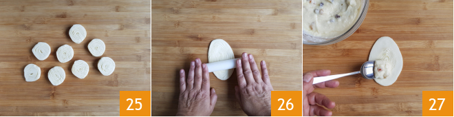 You should obtain 8 swirls 25. Using a small rolling pin, roll each swirl to get an oval shape 26. Place a tablespoon of filling in the center 27,