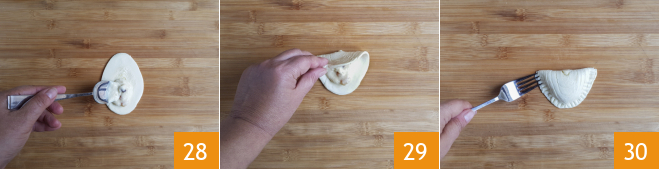 spreading it slightly and leaving a free edge 28. Fold in half to form a pouch 29. Press the edges well and seal them with the tines of a fork 30.