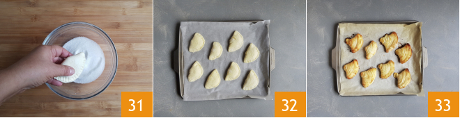 Roll the shells in granulated sugar 31 and transfer them to a baking sheet lined with parchment paper 32. Bake in a preheated static oven at 430°F for about 25 minutes. When they are well-golden, take them out of the oven 33 and let them cool completely before serving.