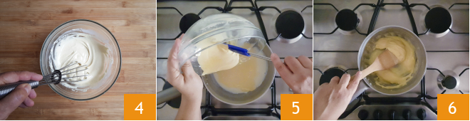 and mix it with the rest using the whisk 4. As soon as the milk starts to boil, pour in the egg, sugar, and flour mixture 5 and stir quickly. Keep stirring until the custard thickens 6.