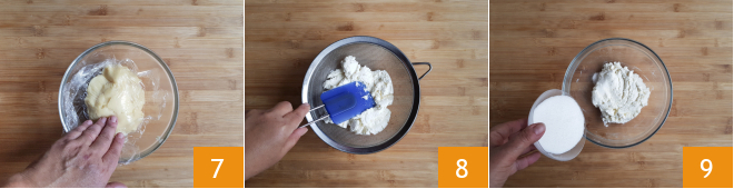Transfer the custard to a small bowl, cover with plastic wrap touching the surface 7 and let it cool. When the custard is cold, sieve the ricotta into another bowl 8, add the sugar 9.