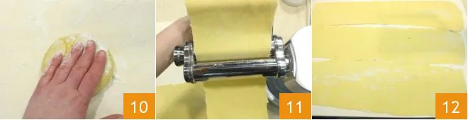 flour it, flatten it slightly 10, and then pass the dough through the pasta machine to the narrowest roller to get a thin sheet (alternatively, you can roll it out by hand with a rolling pin until you get a thin sheet (11-12), then use a smooth wheel to cut it into strips 1/2 inch wide, forming tagliatelle). Once