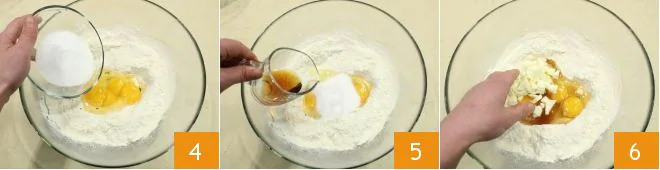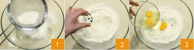 To make the tagliatelle nests with Passito di Pantelleria, start with the fresh pasta dough (for more details, consult our fresh pasta cooking school sheet): place the sifted flour 1, vanilla bean seeds 2, eggs 3, and salt in a large bowl