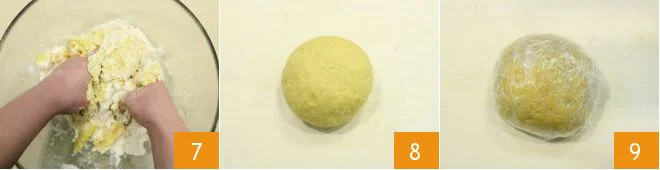 and knead vigorously by hand 7 until you get a smooth, homogeneous, and elastic dough 8 (alternatively, you can use a stand mixer to knead). Divide the obtained dough into 3 pieces; take one, ensuring to cover the others with plastic wrap 9 to prevent the dough from drying out,