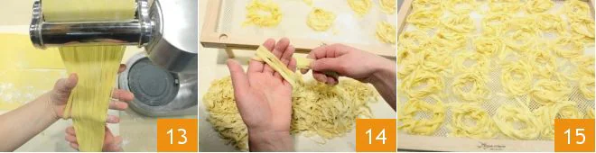 the sheets are made, cut them with the appropriate roller for tagliatelle 13. Take two tagliatelle, gently roll them around your fingers to form a sort of nest 14 and place them on a suitable rack 15 or on a floured cloth. Continue this way until the fresh pasta is finished, you should obtain about 40 nests.