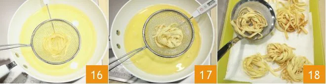 Now attend to cooking: heat some seed oil on the fire, take a nest and immerse it in the hot oil 16 (the ideal frying temperature is 340°F-355°F) and when it is golden, drain it 17 and place it on a tray lined with kitchen paper 18. When the sweet tagliatelle nests with Passito di Pantelleria are cold, sprinkle them with powdered sugar and enjoy!