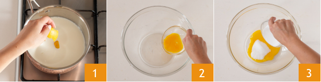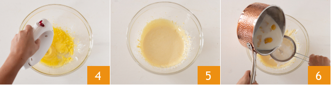 Beat the egg yolks with the sugar 4 with an electric mixer until they are thick and frothy 5. Gradually add the sifted flour and mix; then, slowly pour in the hot milk, filtering it through a sieve to retain the lemon peel 6.