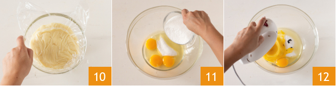 Then transfer the cream to a bowl, cover with plastic wrap 10, and let it cool first at room temperature and then in the fridge. Now prepare the cake: in a mixing bowl, pour the eggs with the sugar 11, add the vanilla bean seeds, and beat them with an electric mixer 12 until thick and frothy.