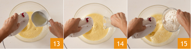 Slowly add the oil 13, milk 14, and finally the flour and baking powder 15.